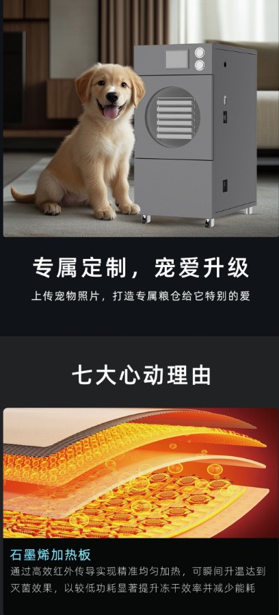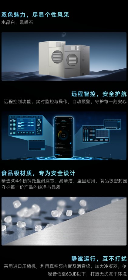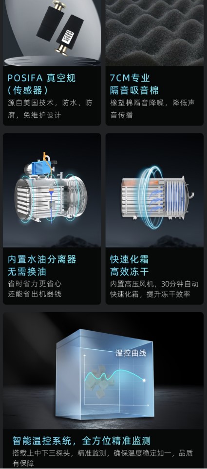 3、操作便捷:一體式方形設(shè)計(jì),物料可同倉(cāng)冷凍干燥,整機(jī)體積小密封性強(qiáng)使用方便效率高;設(shè)備底部可設(shè)滑輪,方便移動(dòng)定位;真彩觸摸屏,控制精度高,性能穩(wěn)定,程序簡(jiǎn)易上手快。
